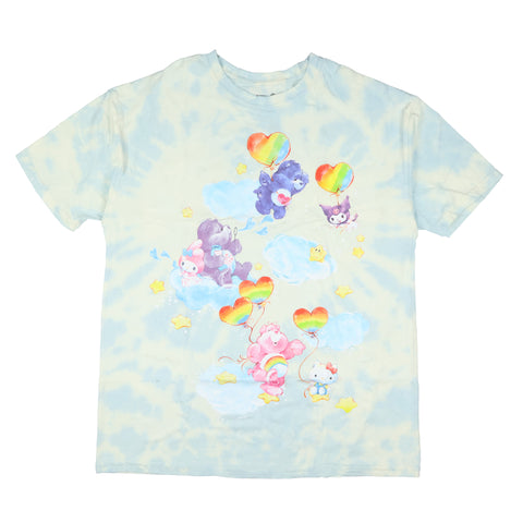 Step into a world of nostalgia and whimsy with this adorable Hello Kitty and Care Bears t-shirt! Featuring Cheer Bear, Share Bear, and Harmony Bear alongside Hello Kitty, Kuromi, and My Melody, this dreamy design brings beloved characters together in a floating cloudscape of balloons, stars, and shimmering glitter. The soft blue and white tie-dye background adds to the magical feel, making this tee a must-have for fans.