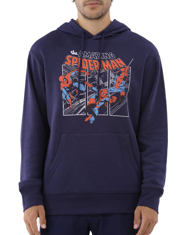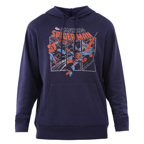 This men’s Spider-Man hoodie captures the energy of the character in action, with a comic-inspired layout that shows three unique poses across bold cityscape panels. Whether he’s swinging on his web, gearing up for a punch, or mid-air in a full-leg extension, the artwork gives the hoodie a layered, in-motion look that sets it apart from basic prints. The kangaroo pocket, drawstring hood, and ribbed trim give it that familiar, easy-wearing feel.