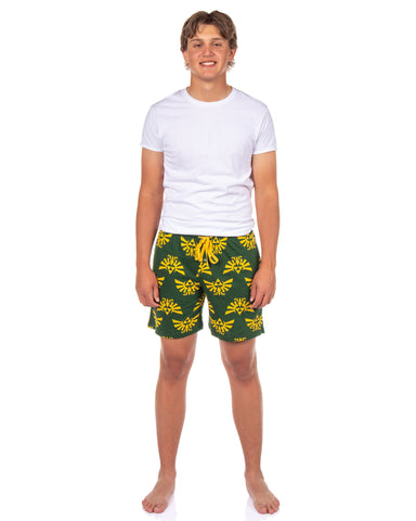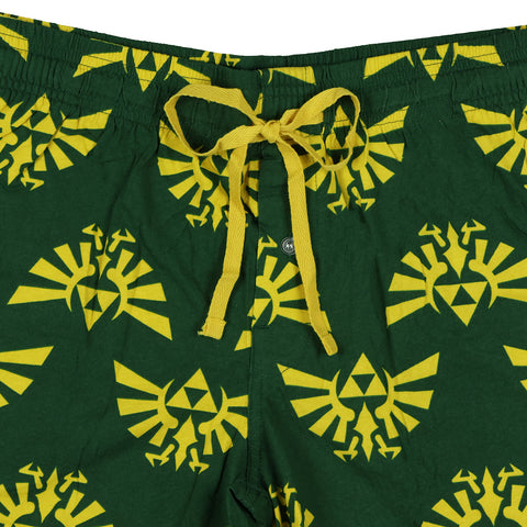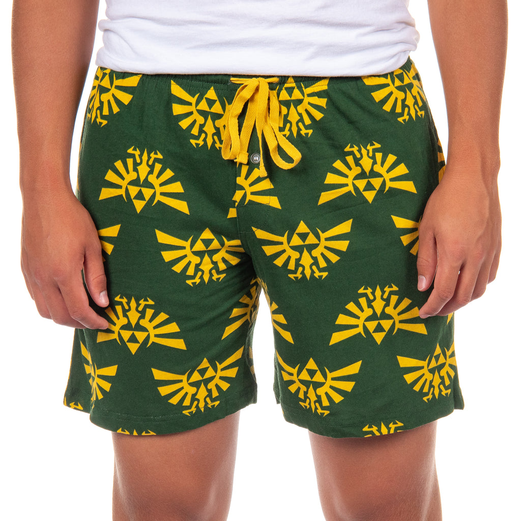 These men's Legend of Zelda lounge shorts are built for everyday wearability. They are made of lightweight 100% cotton fabric that breathes well and feels soft against the skin. The 7-inch inseam offers relaxed coverage, while the drawstring waist and one-button fly add everyday convenience. The cut provides a comfortable fit, whether on the couch or heading out for a casual walk. The all-over Wingcrest design reflects the Royal Crest symbol from the Zelda universe and is printed in a tiled layout across the fabric for a bold, detailed look. Whether worn as PJ bottoms, sleepwear, or gamer lounge shorts, these trunks are made for comfort and personal style with reliable function in every stitch.
