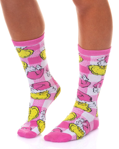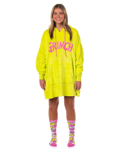 And let’s not forget the socks! Included pink checkerboard knee-highs have a non-slip grip on the bottom, so you can shuffle around the house or dorm without a worry. Oversized and roomy, this hoodie doubles as the ultimate comfy nightshirt or loungewear top. Made from 100% soft polyester, it’s easy to wash, super cozy, and perfect for long nights of relaxing, snoozing, or just goofing off. Whether you're hanging out at home, chilling at a sleepover, or layering up at a game, this Grinch set has got you covered.